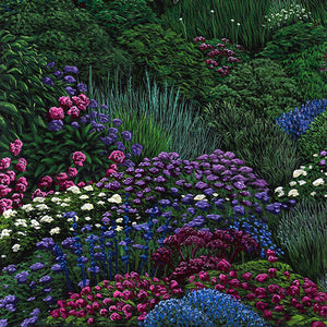 Blue and Purple Hues 2, is an open-edition framed reproduction print of a two-panel diptych. The artist, Anna Evans, expertly captures the depth and vibrancy of a purple garden, highlighting each leaf and flower with illuminating detail to create a textured and captivating floral scene.