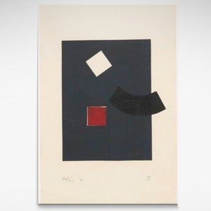 This print, "Untitled 1965, Blue Squares", is an open-edition reproduction of a screenprint by Ralph Hotere. Originally created during Hotere's time in Europe, it now forms part of a collection of his art prints that are housed in Te Papa Tongarewa.